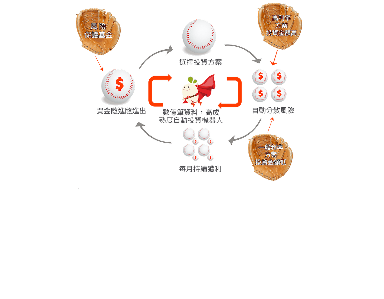 類基金投資模式,讓 AI 智能配置您的資產,分散投資風險,『 除了原有蘿蔔投+的優勢外,再增加風險保護,讓案件風險更低!』在低利的時代。